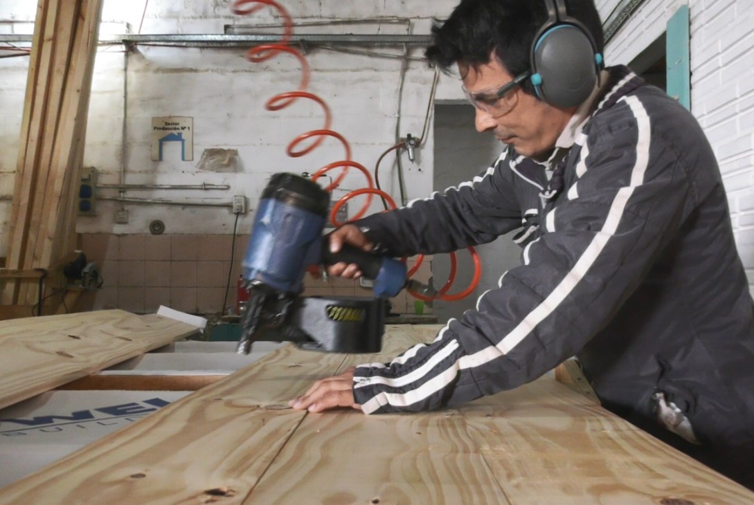 “Está pensada para cuatro operarios la fábrica y tiene una capacidad de producción de 40 y 50 viviendas mensuales. Este año vamos a estar cerrando, si todo sale bien, entre lo ya producido y lo planificado en 500 de 550 viviendas. En Posadas desde el 2016 llevamos aproximadamente 2.500 viviendas producidas hasta este año. La materia prima es de la zona y se trabaja mayoritariamente con pino, para algunas viviendas para lo que es la base usamos pino impregnado y en otros usábamos madera de eucalipto”, mencionó Lucas Hillebrand, encargado de la fábrica de Viviendas Techo a Canal 12.