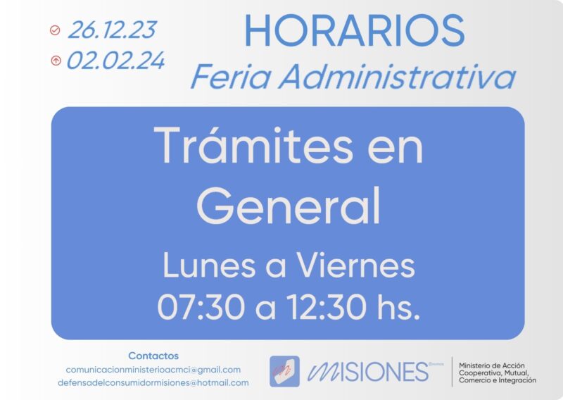 El Ministerio de Acción Cooperativa, Mutual, Comercio e Integración, que administra Liliana Rodríguez, comunica que a partir de hoy martes 26 de diciembre de 2023 y hasta el viernes 02 de febrero de 2024 estará vigente la Feria Administrativa dispuesta por el Gobernador de la Provincia de Misiones, Hugo Passalacqua, mediante el Decreto 165/2023.