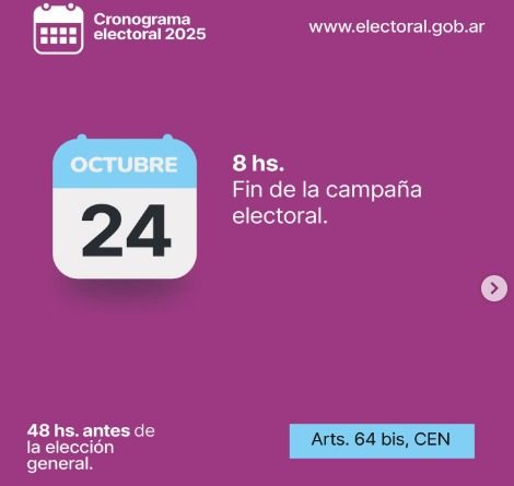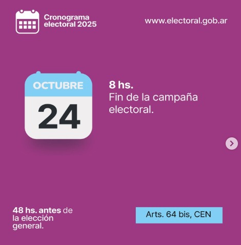 Desde este viernes 24 de octubre a las 8:00 de la mañana entra en vigencia la veda electoral en todo el territorio nacional, en el marco de las Elecciones Legislativas 2025, que se llevarán a cabo el domingo 26 de octubre.