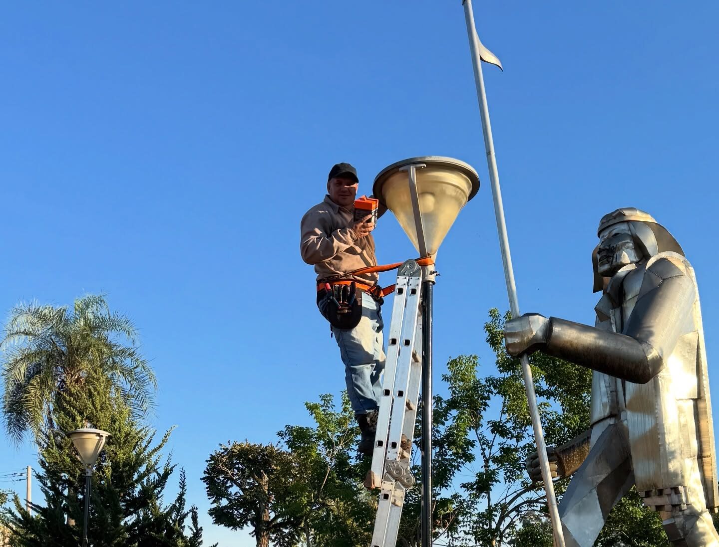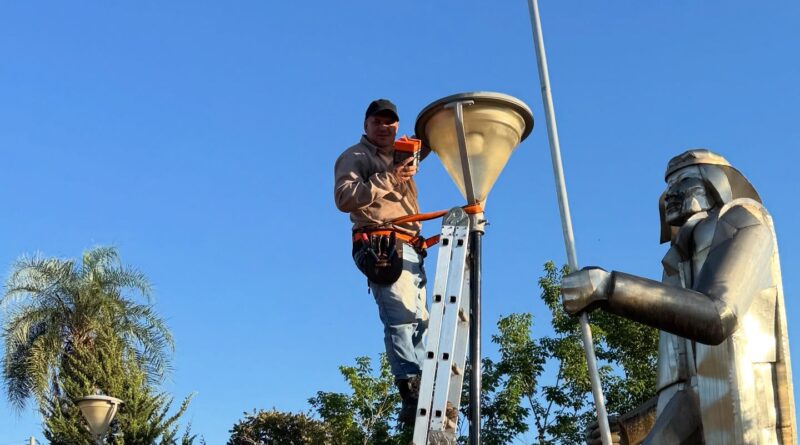 La Municipalidad continúa llevando adelante trabajos de mantenimiento y mejora en la iluminación de la plaza central, a través del recambio de focos en distintos sectores del espacio público.